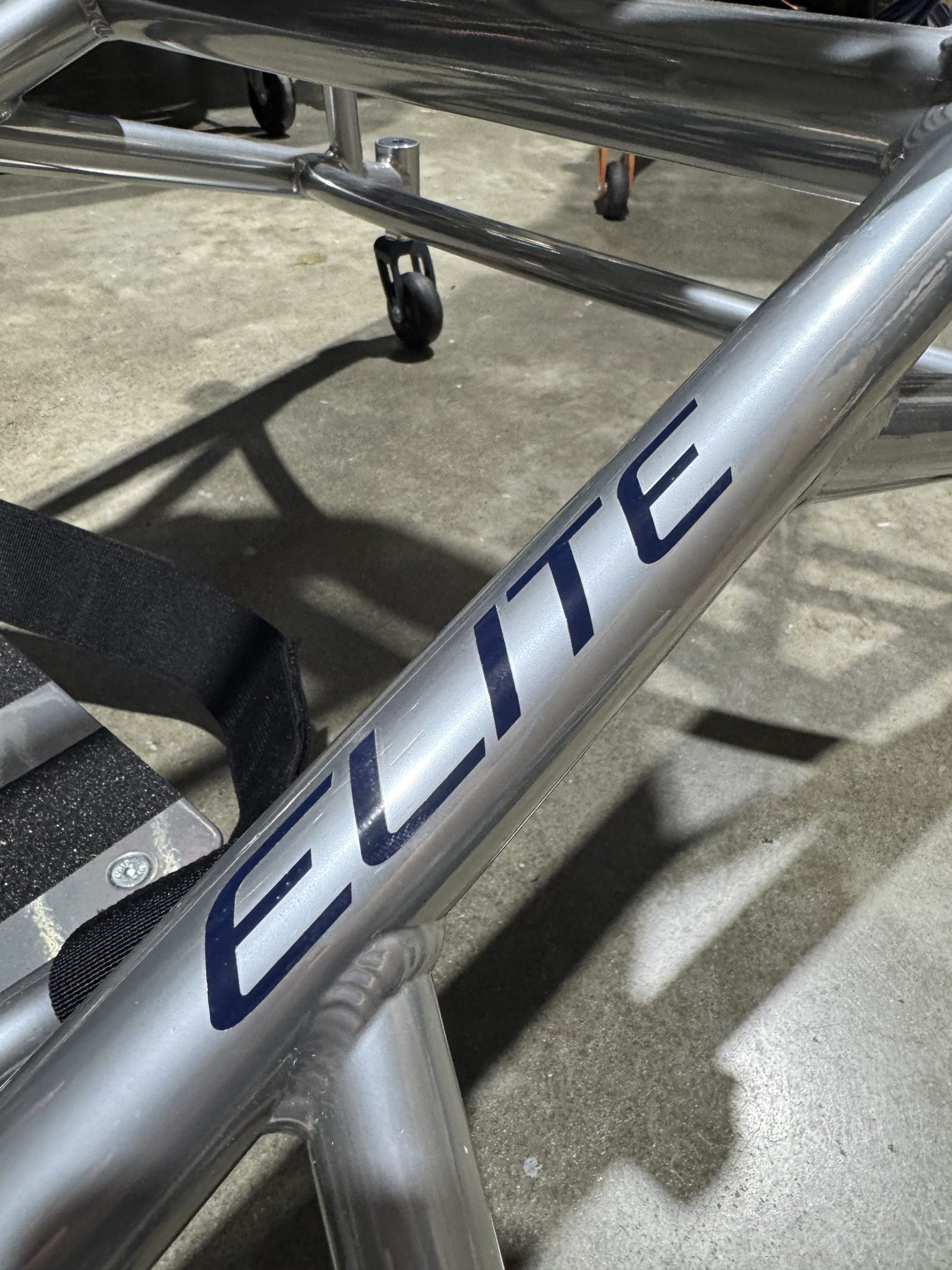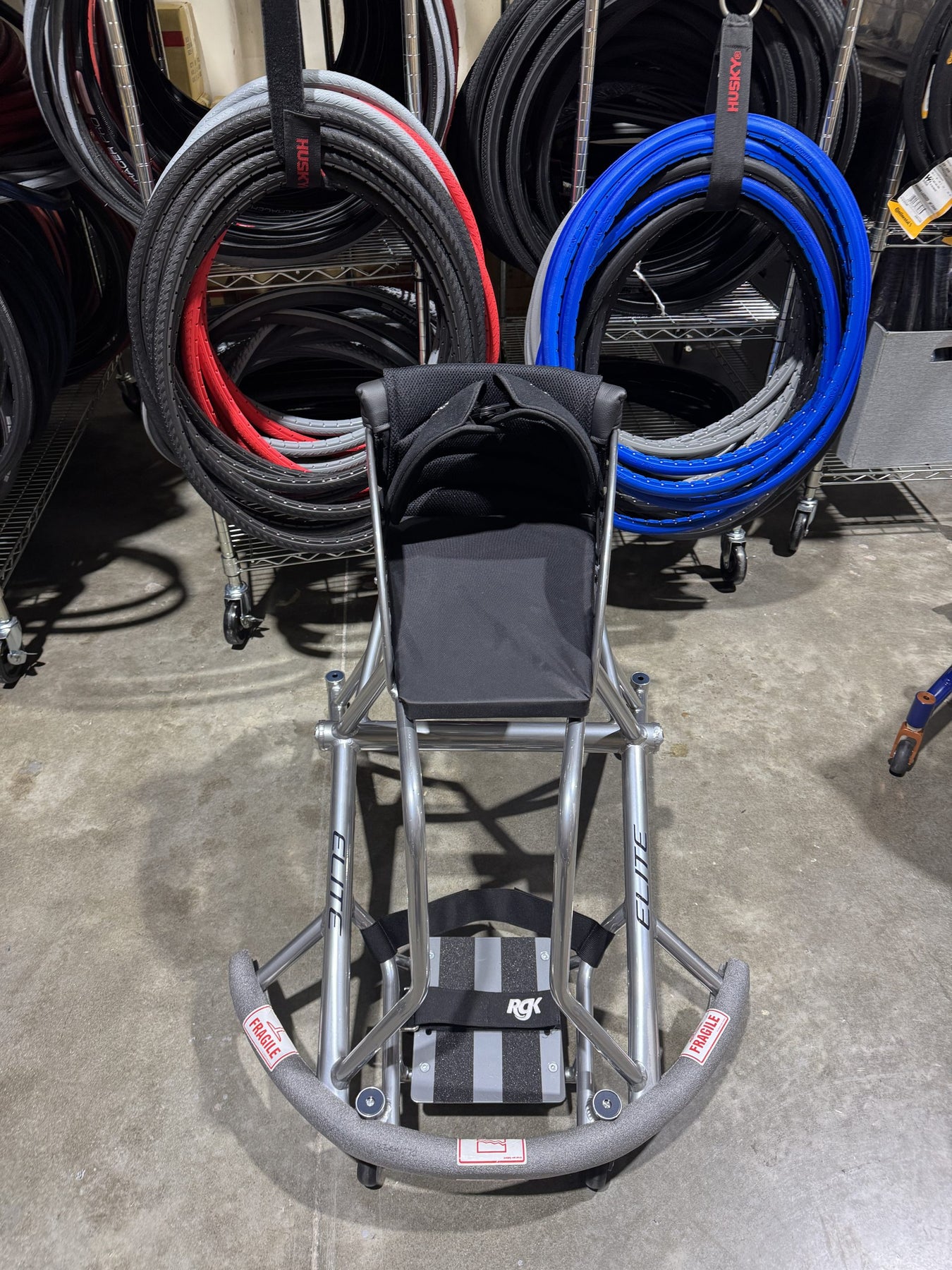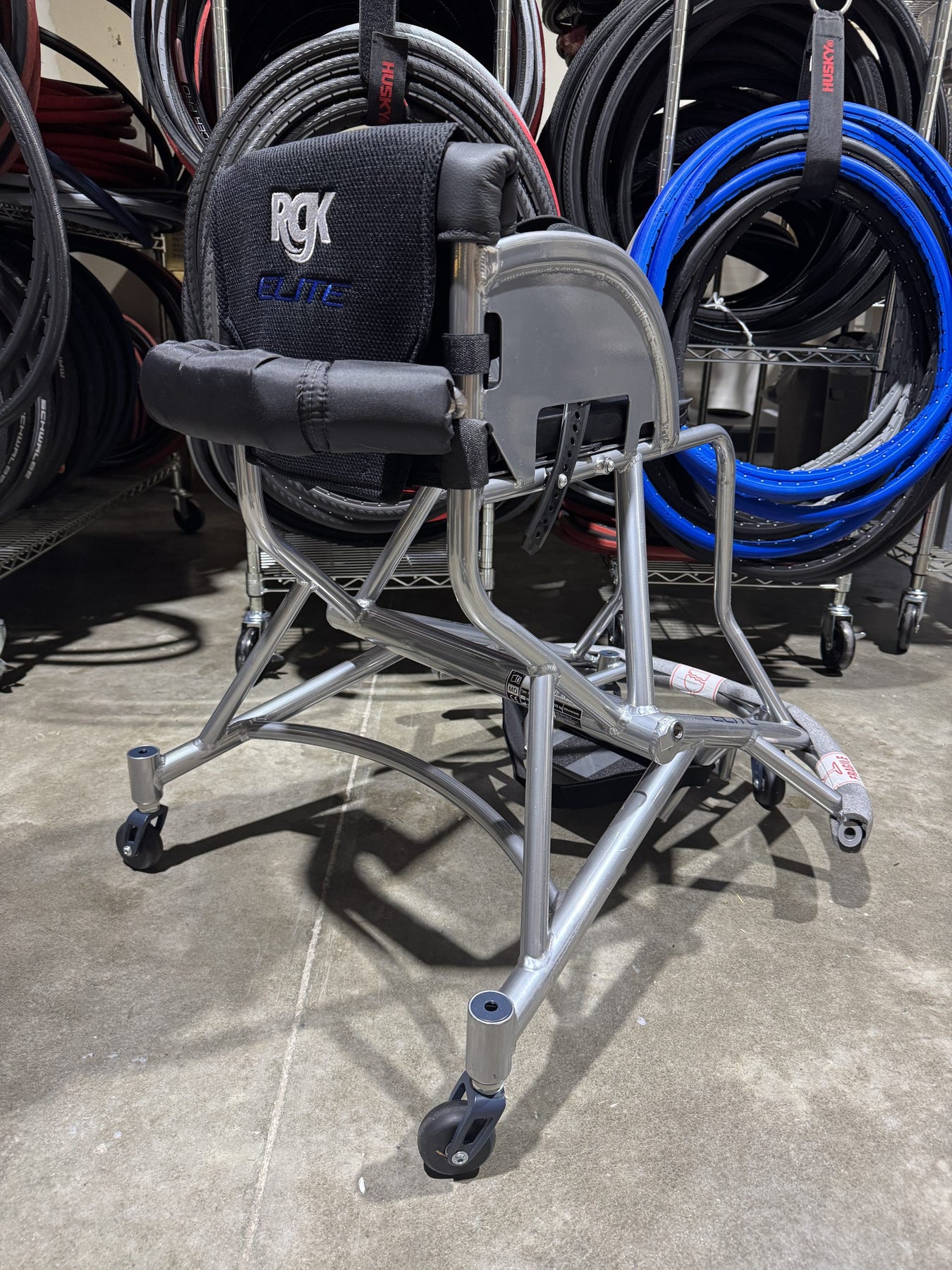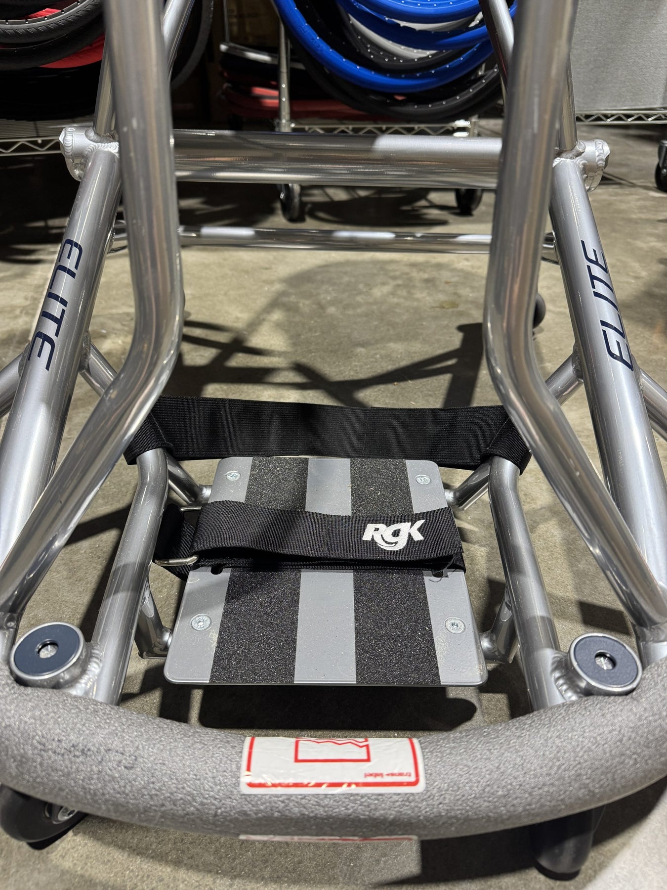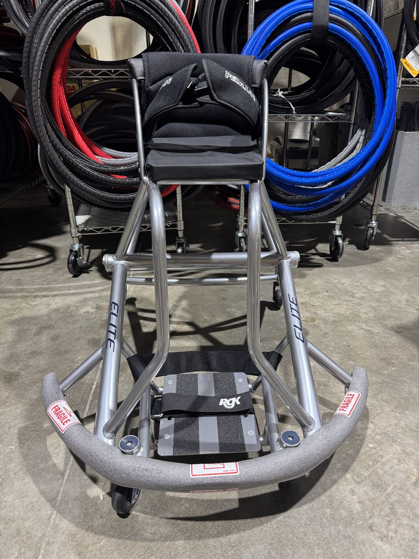 You're looking at a brand new "Pre-Built" RGK ELITE basketball wheelchair, ready to ship ASAP!  This is a "High-Pointer" chair built for a single-leg high amputee. Comes with a solid seat plate. Features custom painted "Chrome Mirror" powder coated frame, which looks like the "Polished" frame upgrade. Only 1 in stock. Purchase before this deal is gone! Specs and upgrades are noted below. Note, this basketball wheelchair is built with DUAL rear anti-tips. MEASUREMENTS: