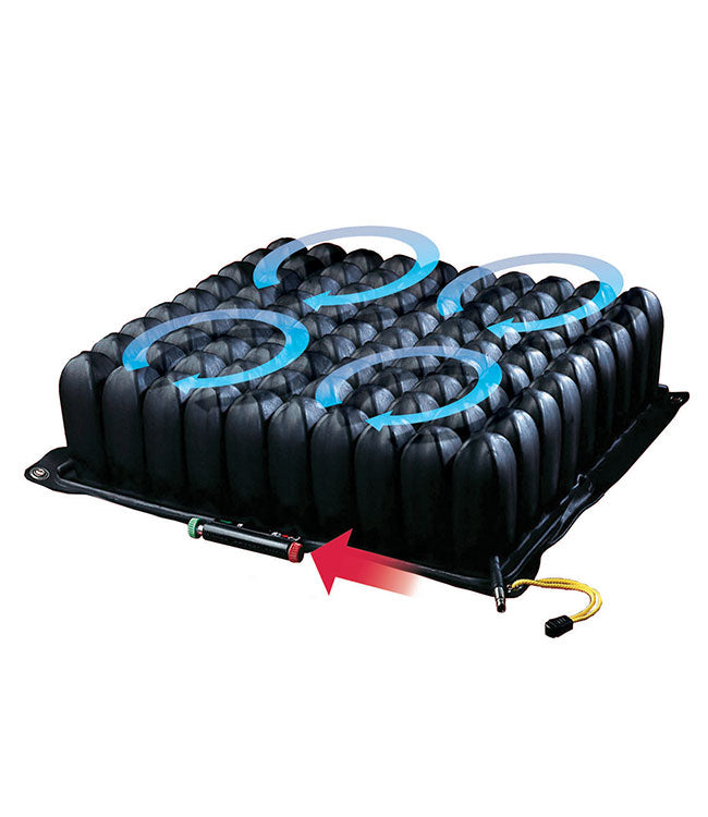 ROHO Quadtro Select Low Profile Wheelchair Cushion is a premier 2" (5 cm) tall four compartment cushioning product with ISOFLAP valve which offers AIR IN PLACE progressive positioning for both skin protection and positioning for posture and increased function. The low profile wheelchair cushion can be adjusted over time to correct, counteract, or fine-tune a seating stability problem.