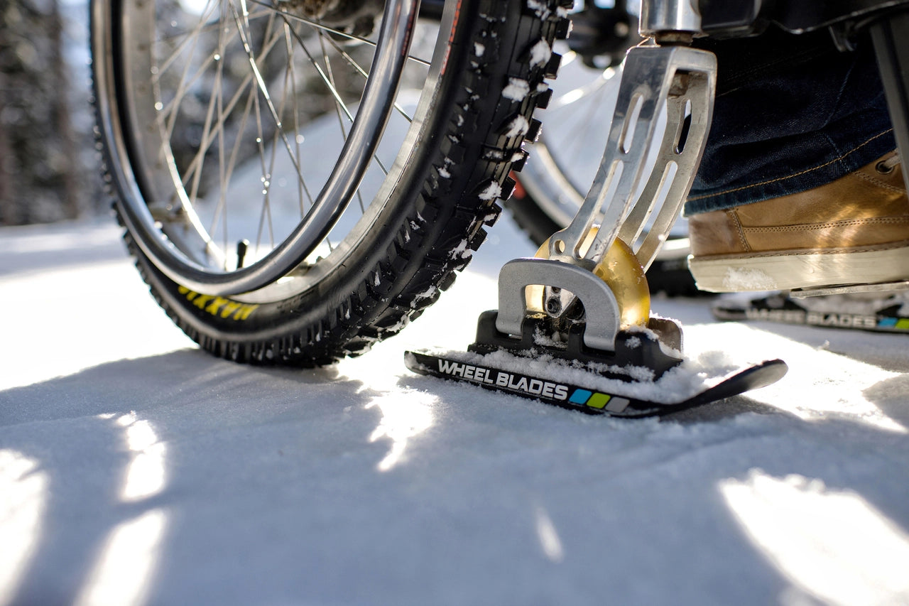 Wheel Blades are small, high-end skis that attach to the front wheels of your wheelchair with one simple click.