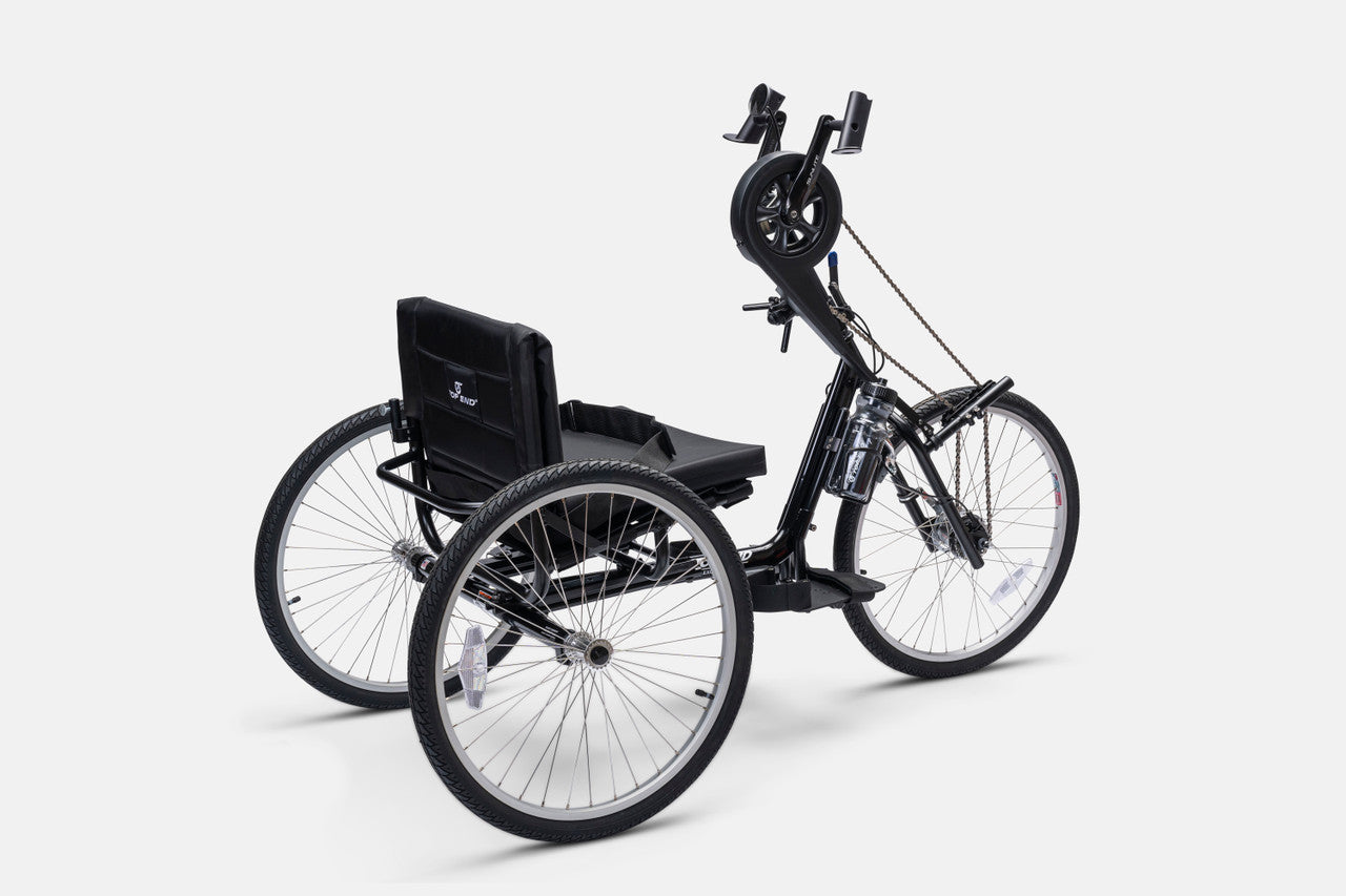 Stable, maneuverable and easy to transfer into and out of, our Custom Excelerator™ Handcycle can go up to 15 mph. The smooth Shimano shifter lets you tackle hills or level terrain with equal ease.The 7-speed Shimano hub with reverse braking means your hands never have to leave the pedals. The tri-pin quad hand pedals are a popular option for those who have impaired hand function, and the mountain drive transmission is great if you have low endurance or steep terrain to climb. FEATURES: Carbon steal frame & fork Adjustable seat: forwards and backwards Adjustable back height Fold over back upholstery Adjustable crank height Chain tension idler Full chain guard, reflectors, and safety flag Adjustable height/angle footrest system Shimano® 7 speed hub w/ reversing drum brake Parking break 175 mm crankset w/ one chain ring Ovalized ergonomic hand pedals Performance wheels w/ cruiser tires Quick release axles 3º camber Cushion and hook & loop seat restraint Weight capacity 350 lb Handcycling is a great way to have fun, get fit and stay active so you can enjoy life to the fullest – so get cranking. Stable, maneuverable and easy to transfer into and out of, the Excelerator Stock Handcycle can go up to 15 mph. The smooth Shimano® shifter lets you tackle hills or level terrain with equal ease. The 7-speed Shimano® hub with reverse braking means your hands never have to leave the pedals. The QuadGrips or tri-pin quad hand pedals are popular options for those who have impaired hand function, and the mountain drive transmission option is great if you have low endurance or steep terrain to climb. Totally adjustable, the Excelerator Stock Handcycle features a simple fore-aft sliding seat, uncomplicated adjustable footrest system and a straightforward crank height adjustment with a fully adjustable chain tension idler so there is no need to add or remove chain links. Standard safety features include: reflectors, full chain guard, footrest safety straps, safety flag, cushion and seat restraint. If you want a specific seat width or color, our custom Excelerator Handcycle can be built to your specifications, plus you can order the V crankset option with its wider cranks to allow more clearance for those who are tall or big. Creating a perfect, custom fit chair requires a few more days of production, but it is worth it for those looking for a streamlined fit. Weight Capacity: 350 lb. / approx. 159 kg.