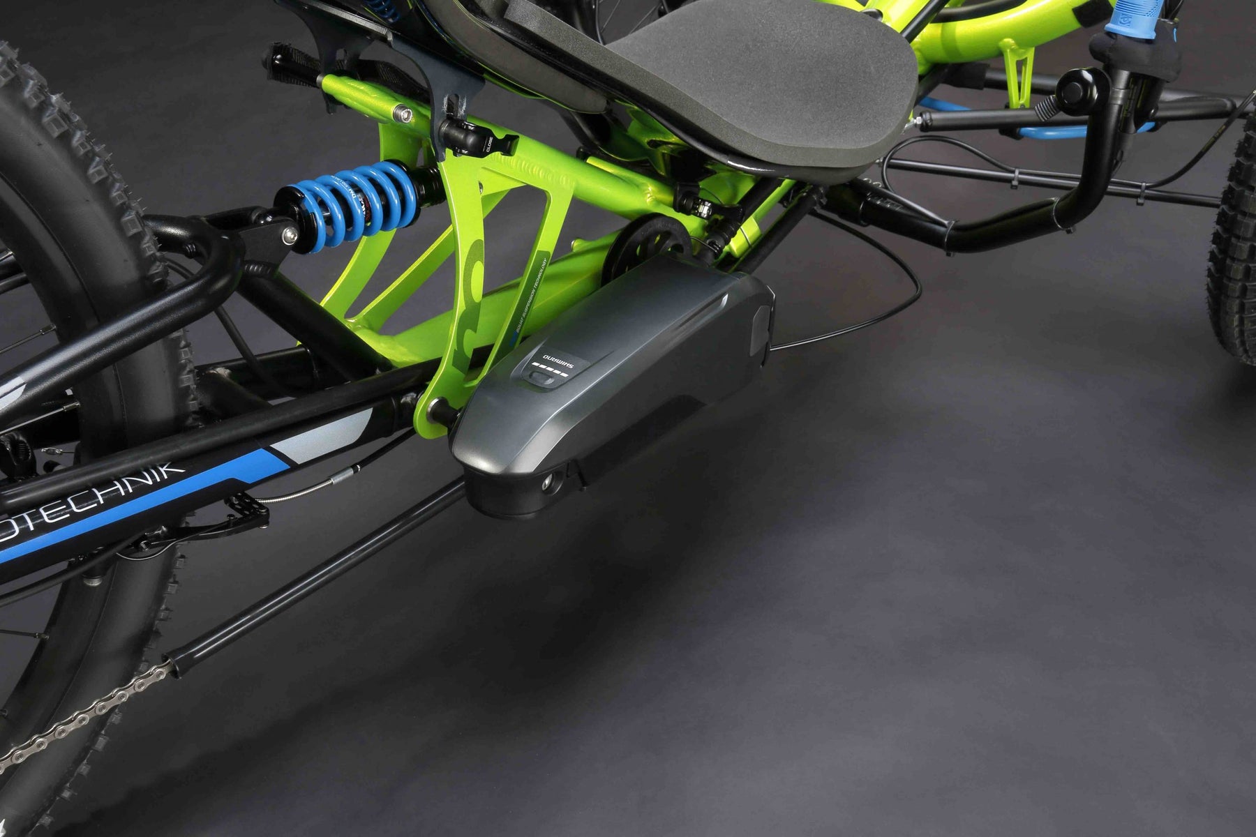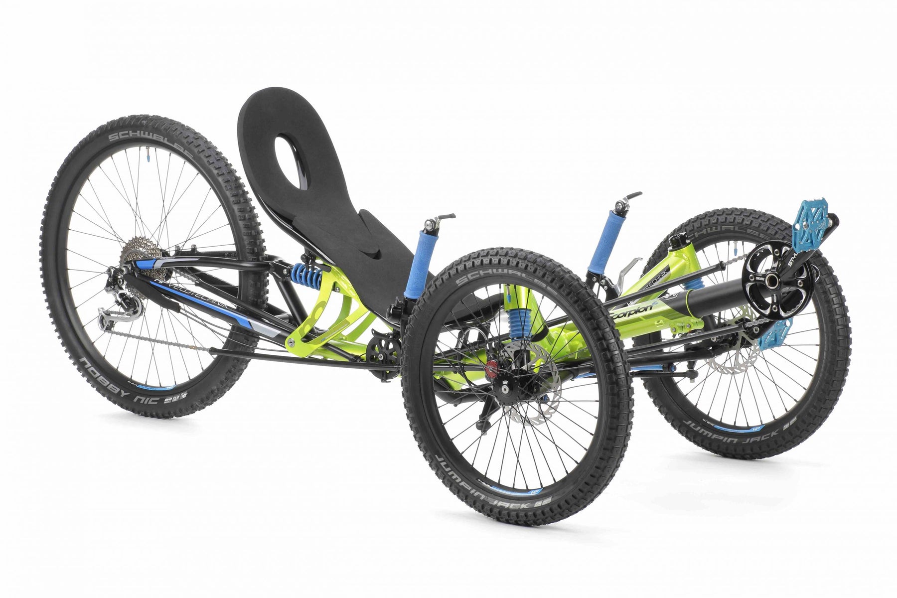 The absolute best mountain bike trike available! From the very first glance at the Scorpion fs 26 Enduro, you begin to feel your heart beating. The bright green full suspension frame with sky blue accents and the powerful studded 26 inch rear wheel state very clearly: This off-road machine is eager for some serious dirt rides!