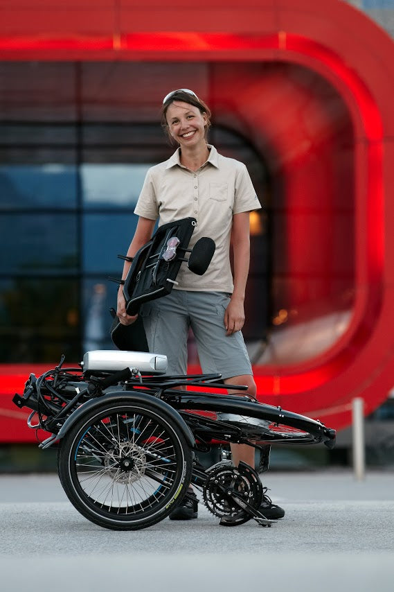 The low air resistance thanks to the efficient recumbent position extends the rechargeable battery's range, especially at the high assisted speeds of up to 45 km/h reached by the speed pedelecs. At such high speeds, a well-aligned, full-suspension chassis is extremely important. The S-Pedelec Scorpion fs 26 won the prestigious Eurobike Award 2012 for its particularly innovative design and above-average product quality. The jury of the iF International Design Forum consists of specialized journalists, design-experts and sport scientists. They score among other things efficiency, ergonomics, practical value, weight, safety, environmental compatibility and workmanship. You don't need Alpine passes, hairpin bends, or luge tracks to enjoy the Scorpion fs 26s impressive ride dynamics. HP Velotechnik's agile speed trike demonstrates its strengths on the commute to work or during spontaneous weekend excursions. A glance at the performance data makes it clear: This trike represents ultimate performance and fulfills the highest demands for exclusivity and versatility thanks to the broad range of optional features. Experience yourself by testing the ideal trike for people for whom the everyday is becoming ever more extraordinary. The S-Pedelec Scorpion fs 26 with driving assistance up to 45 km/h is in countries under EU-law defined as a multilane vehicle. For those vehicles exist other regulations than for usual bicycles. In just a few simple steps, it only takes a minute for you to fold up your Scorpion fs 26 into a space-saving package with dimensions of 123 × 83 × 62 cm. If you remove the wheels as well, the dimensions reduce even further to a compact 93 × 74 × 54 cm. Even with the luggage rack and fenders attached, the Scorpion fs 26 can still be folded up without removing the wheels. And the chain? This rotates around its own axis and remains where it should be, guided by the flexible chain guard tubes.