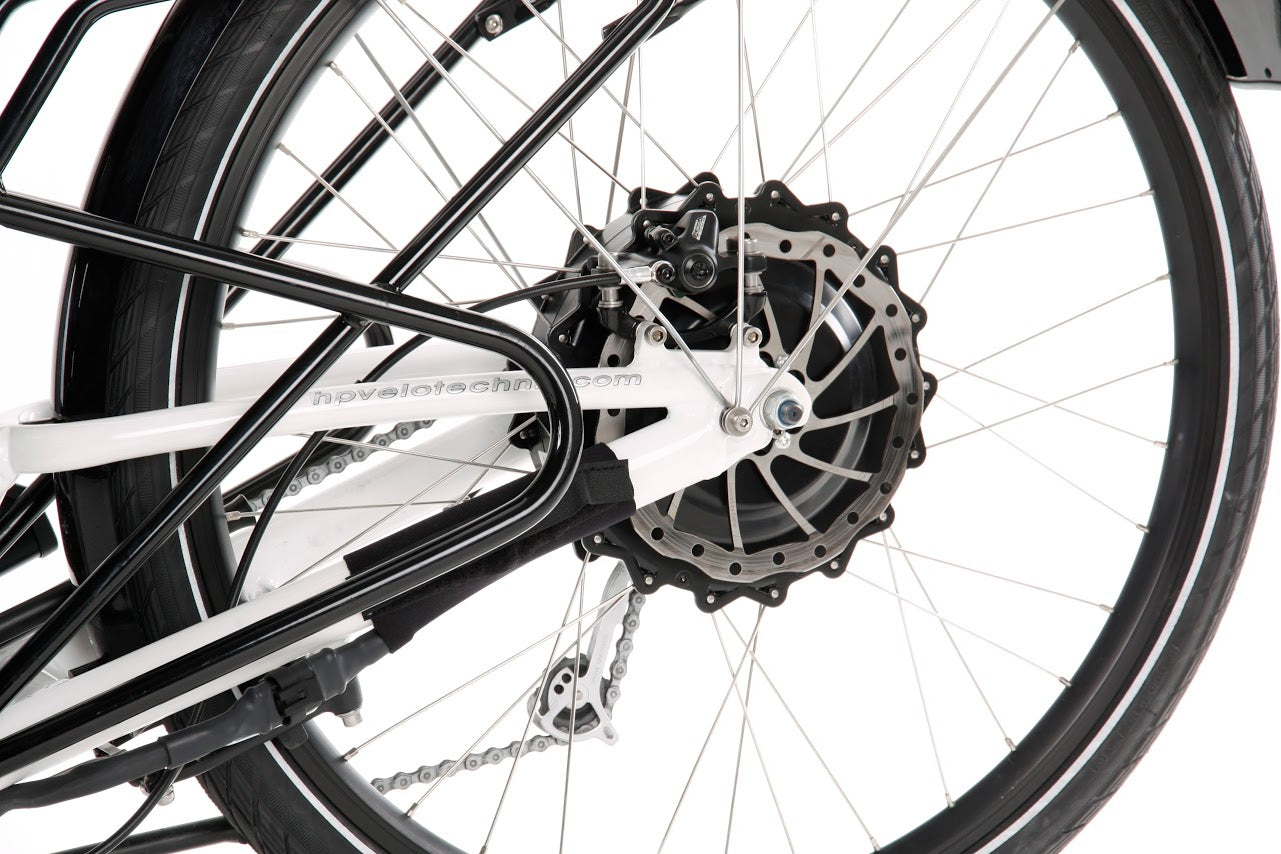 The speed pedelec is driven by a high-performance 500 watt rear wheel hub motor. A 36 V Li-Ion rechargeable battery with a 558 Wh capacity provides a great deal of energy. The recuperation function, which uses the motor as a generator when braking, extends the range through energy recovery. The trike comes with a start assist function as standard, which propels it to a speed of up to 20 km/h at the push of a button without pedaling.